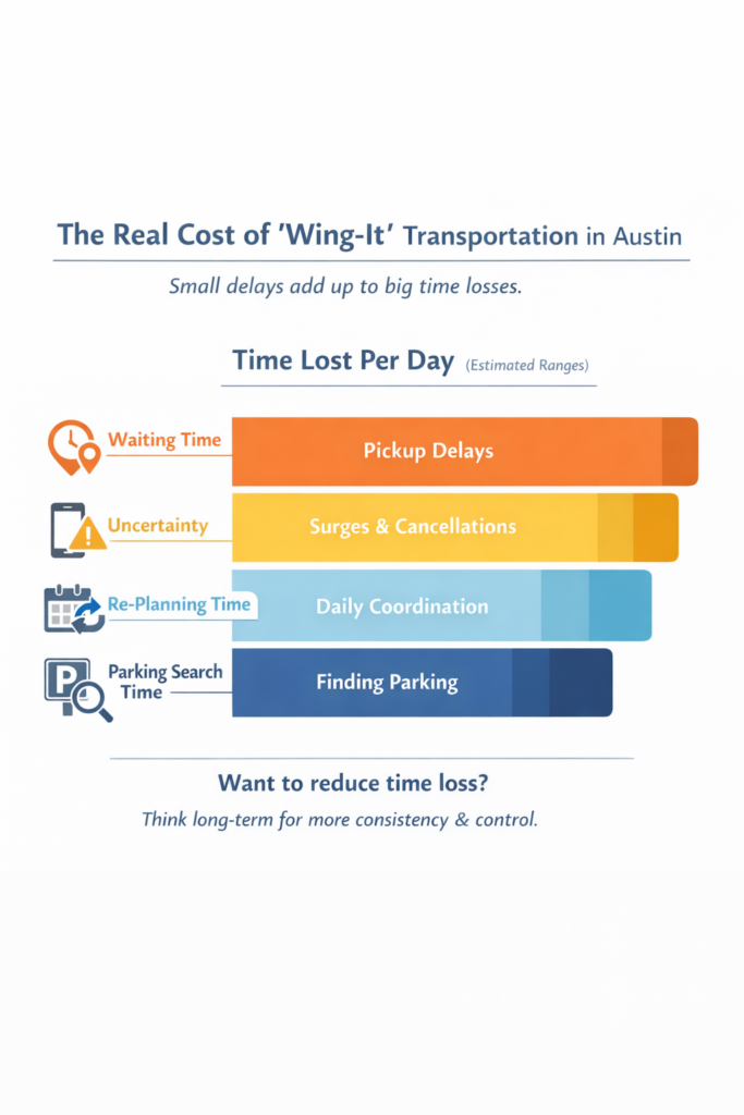 Austin work trips sometimes turn into longer stays or include weekend plans, extra dinners, and last-minute schedule changes. Day-by-day transportation can become costly and inconvenient to extend.